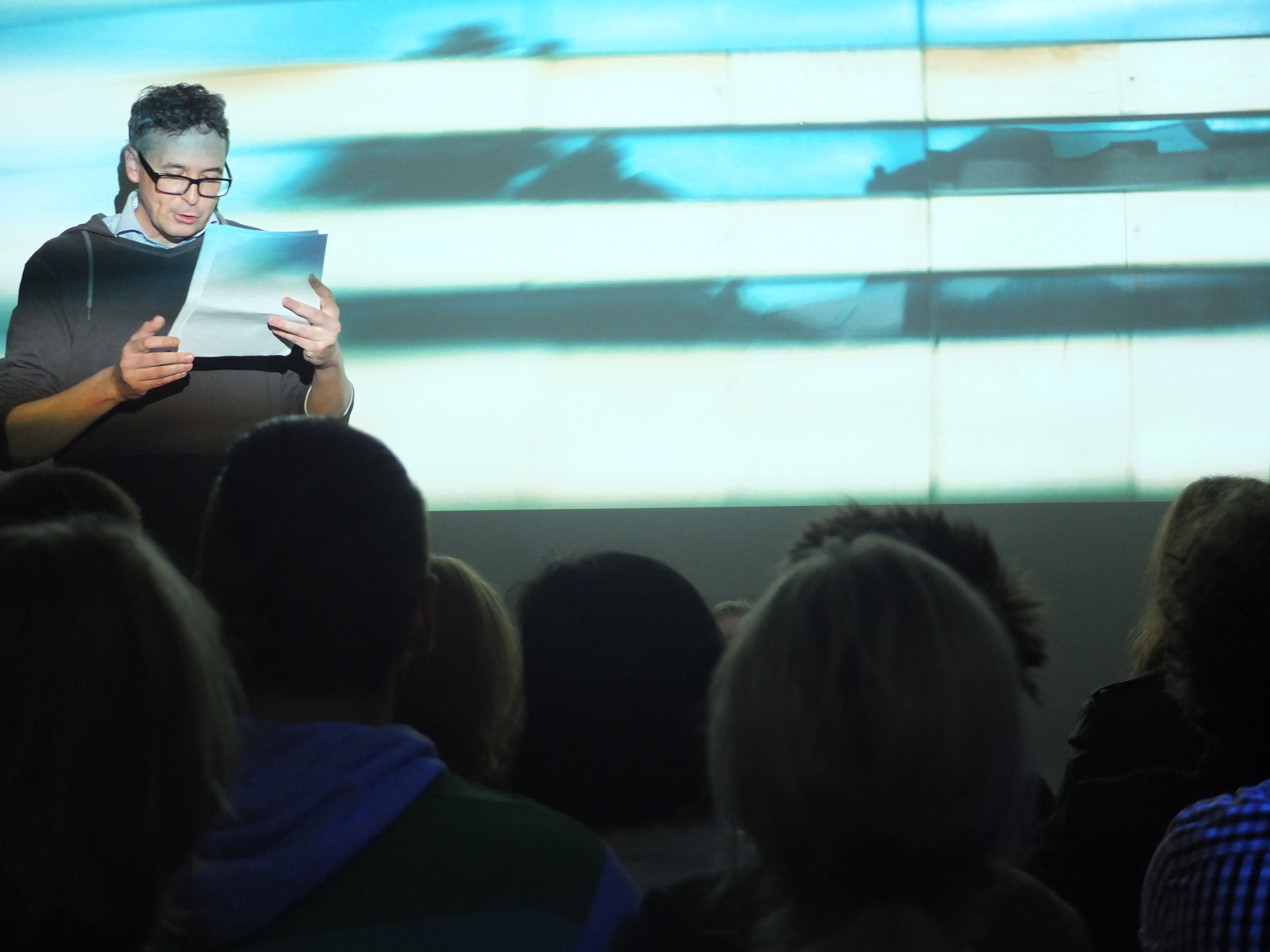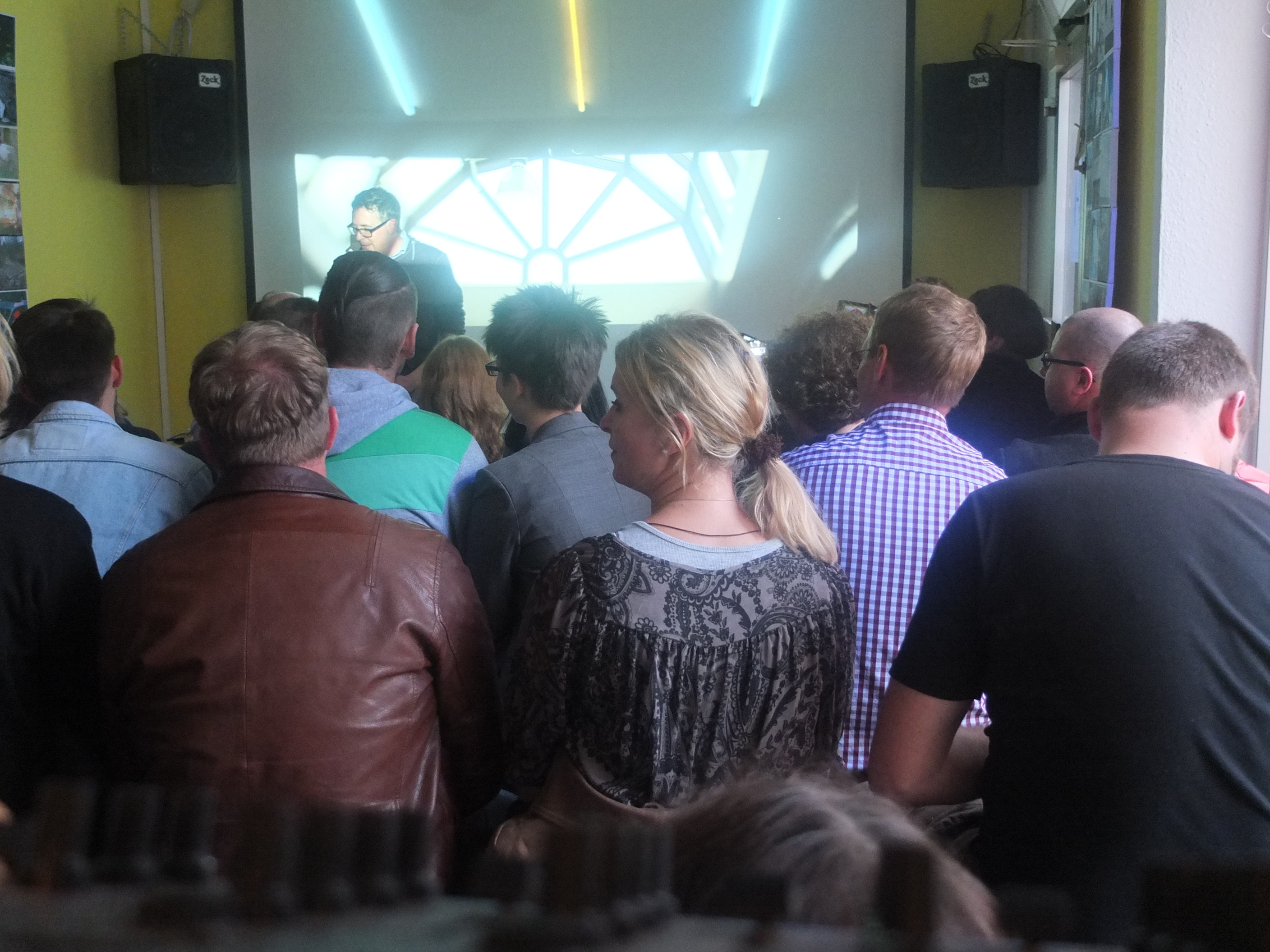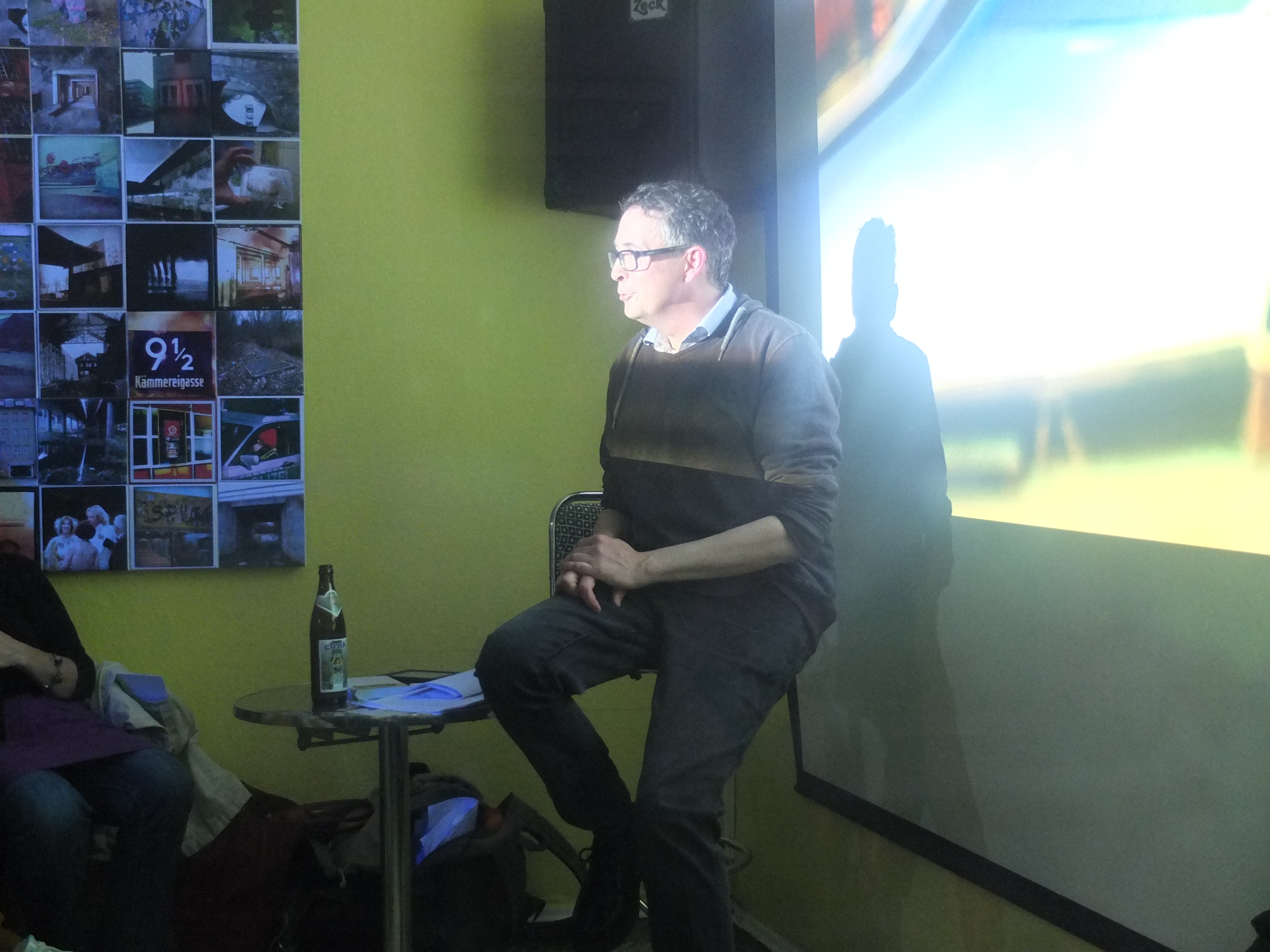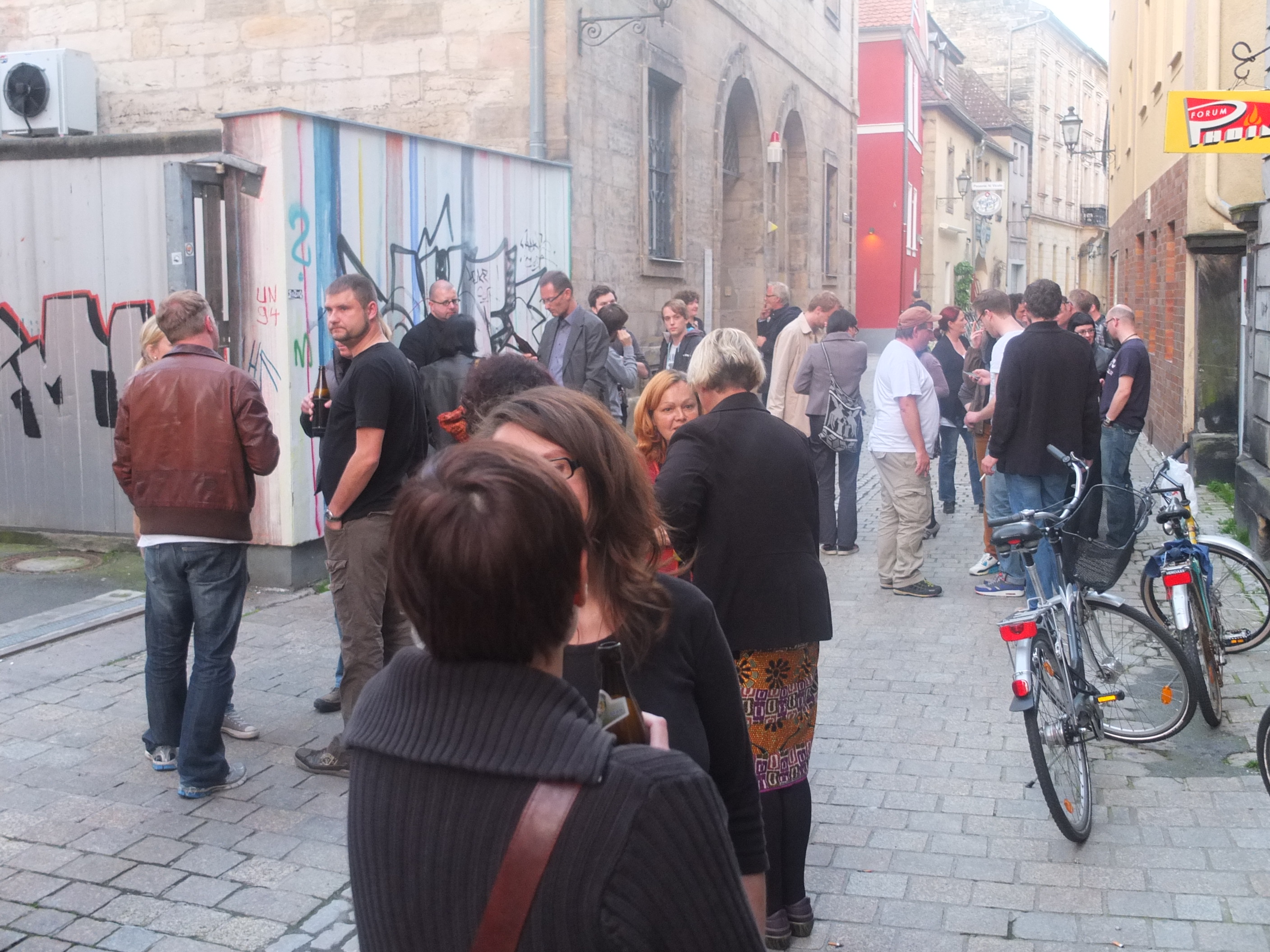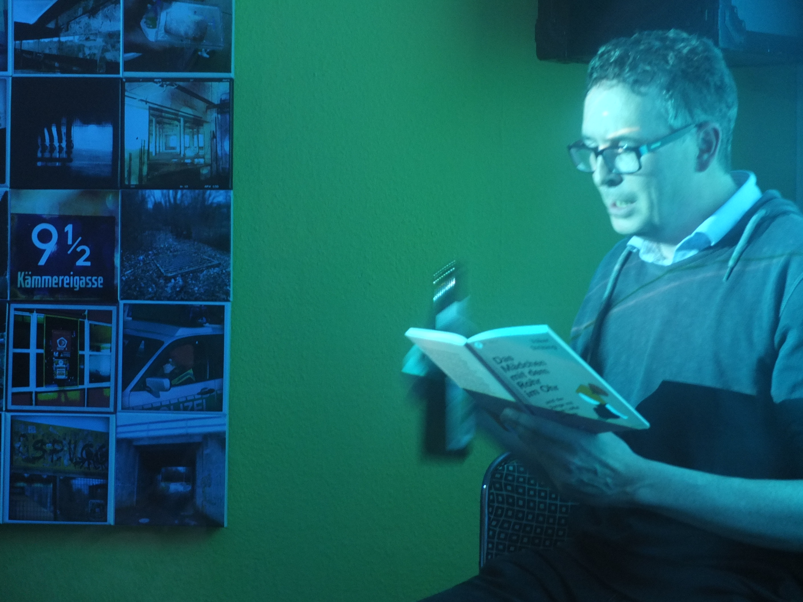 Was tut ein Stadtschreiber, wenn er nicht schreibt? Er liest vor. Volker Strübing, seit 5 Monaten Stadtschreiber von Bayreuth, gebührt die Ehre, die neue Veranstaltungsreihe “SÜBKÜLTÜR am Dienstag“ mit Pomp und Gloria zu eröffnen. Er liest deswegen aus seinen Büchern, von Zetteln und aus seinem Blog “Bayreuther Tagebuch“ und wird damit unsterblich. Wir basteln derzeit an einer überlebensgroßen Büste, wissen nur noch nicht, ob wir sie auf dem Bayreuther Stadtparkett vulgo Fußgängerzone oder vor den braunbraunen Sightseeing-Schildern der Autobahnabfahrten aufstellen sollen. Bis diese Entscheidung steht, die sich bürokratesk noch über Jahre hinziehen kann, werden wir jetzt erst einmal ein Foto von ihm ausdrucken und goldrahmen. Ein Ehrenmitglied ward so geboren.