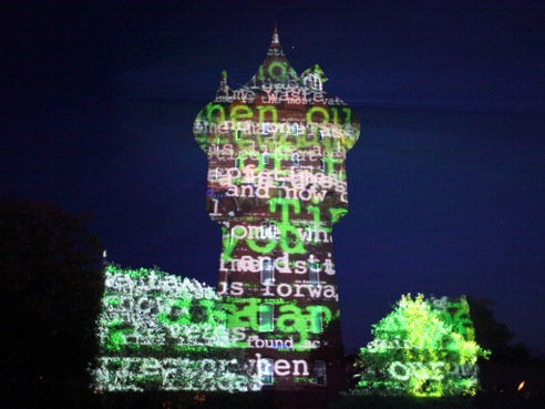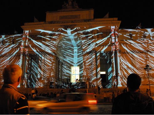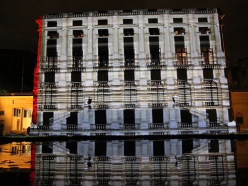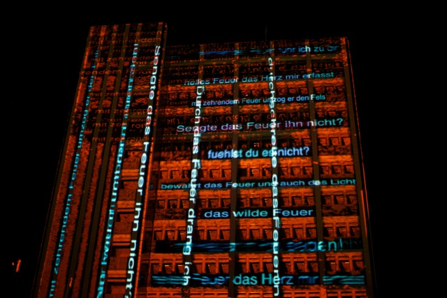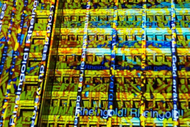 Philipp Geist: ”Anlässlich des 200. Geburtstags von Richard Wagner entwickelt der Berliner Künstler Philipp Geist (1976) über den Zeitraum von 40 Abenden eine flächendeckende Licht- und Video-Mapping-Installation für das Neue Rathaus in Bayreuth. Dabei verzichtet der Künstler auf den Einsatz von Leinwänden und projiziert seine künstlerischen Bild- und Lichtprojektionen direkt auf die Fassade. Die Projektion verschmilzt mit dem Ort und lädt Besucher zum Verweilen am Neuen Rathaus ein. Über den Zeitraum der Installation wird die künstlerische Installation weiterentwickelt und ergänzt. Inhalt ist Richard Wagner und sein Werk; Bilder, Begriffe, Zitate und Assoziationen aus seinen Opern werden künstlerisch interpretiert und in die Installation eingebaut. Dabei werden Begriffe und Zitate aus Wagners Opern als Wörterteppich und abstrakten Wort-Bilder auf die Fassade projiziert. Der Künstler Philipp Geist entwickelt mit seiner Bildsprache seine eigene künstlerische Interpretation der Wagner-Themen. Geist entwickelt einen Dialog zwischen dem Ort, also dem Neuen Rathaus, den Besuchern und dem künstlerischen Werk von Richard Wagner. Der Zugang zum Thema ‚Wagner‘ ist dabei vielschichtig. Zum Einen auf einer ersten, direkten Ebene, werden Begriffe und Bilder seiner Hauptwerke in der Bildsprache von Philipp Geist auf der Fassade zu sehen sein. Einzelne Figuren und Szenen aus dem reichen Repertoire der Bildenden Kunst, aus Gemälden und Illustrationen v.a. aus dem 19. Jahrhundert werden dem Besucher begegnen. Sie werden jedoch verfremdet und in die abstrakten Strukturen von Philipp Geists Bilderwelten integriert. Bekannte Wagner-Themen wie das Feuer, Naturereignisse und Symbole wie der Ring, das Schwert, und den Sturm als Spiegel für die innere Aufruhr werden neu erfahrbar gemacht und tauchen als Bildzitate in der Installation auf. Die Installation zeigt so in nicht narrativer Art Zusammenhänge auf und lässt somit einen anderen modernen und zeitgenössichen Zugang zu dem Werk Wagners zu. So erscheint das strahlende Gesicht des Helden, um sich im nächsten Moment zu verdüstern und zu verschwinden. Die große Leere erscheint durch das in Dunkel getauchte Gebäude und symbol- isiert den Betrug, das Niederträchtige und Düstere im Menschen. Eine Szenerie taucht auf, um gleich wieder in ein grafisches Muster zu zerfließen. Unberührte Landschaften werden zu Pixeln und führen dem Betrachter vor Augen, dass es sich um ein romantisches Ideal handelt. Das Rheingold strahlt und funkelt durch die blaue angedeutete Wasseroberfläche hindurch, um im nächsten Moment zu Staub zu zerfallen. Graue und weiße Partikel schweben über die Fassade, die materielle Vergänglichkeit wird geradezu greifbar. Die Symbolik der Farben wird aus dem Werk übernommen, weiße Segel werden zu schwarzen und umgekehrt, es ist der zeitgenössichen Videoprojektionstechnik ein Leichtes, ganze Schicksalsfragen zu entscheiden. Vielleicht werden die Segel auch zu bunten Dreiecken und fliegen als grafisches Muster über die Fassade davon. So ist auch das Zufällige und Spielerische Merkmal der Installation, die das Tragische und Getragene des Wagner-Pathos herausfordert und eine Vielzahl von Anknüpfungspunkten für das Publikum jeden Alters ermöglicht. Die Installation feiert Wagner, macht aber auch kritische Stimmen sichtbar: Polarisierungen wie ‚Genie‘ und ‚Kitsch‘ treffen aufeinander und ziehen sich gemeinsam über das Gebäude, Zitate wie Wagners: ‚Aber, aber, was sollen die Sentimentalitäten‘ wandern die Fassade entlang. Auf einer weiteren Ebene werden die Ansätze, welche Wagner verfolgte, auch für Geists Installation von Bedeutung sein: Wagner überschritt die Grenzen der verschiedenen Künste und Inhalte. Er brachte Bild und Ton, Musik und Geschichten, Symphonie und Sagen zusammen. Auch die Installation von Geist ist geprägt vom Crossover: Der Multimedia-Künstler erschafft ein synergetisches Werk auf dem Rathaus, lässt aus Texten Bilder entstehen und mischt Analoges mit Digitalem, indem er mit Licht und dem Computer malt.”
